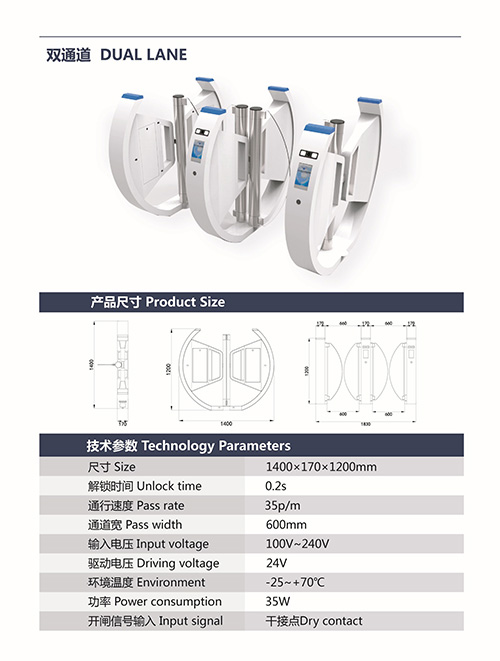 R3012 1.尺寸: 1400x170x1200mm 2.解鎖時(shí)間: 0.2s 3.通行速度: 35p/m 4.通道寬: 600mm 5.輸入電壓: 100v~240v 6.驅(qū)動電壓: 24v 7.環(huán)境溫度: -25~+70℃ 8.功率: 35w 9.開閘信號輸入: 干接點(diǎn) 10.產(chǎn)品包裝: 紙箱+珍珠棉 11.產(chǎn)品型號: R3012